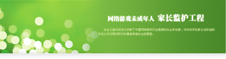 “网络游戏未成年人家长监护工程”是一项由跃客网根据国家有关规定而发起的一个项目,由中华人民共和国文化部指导,旨在加强家长对未成年人参与网络游戏的监护,引导未成年人健康、绿色参与网络游戏,和谐家庭关系的社会性公益行动。它提供了一种切实可行的方法,一种家长实施监控的管道,使家长纠正部分未成年子女沉迷游戏的行为成为可能。该项社会公益行动充分反映了中国网络游戏行业高度的社会责任感,对未成年玩家合法权益的关注及对用实际行动营造和谐社会的愿望。